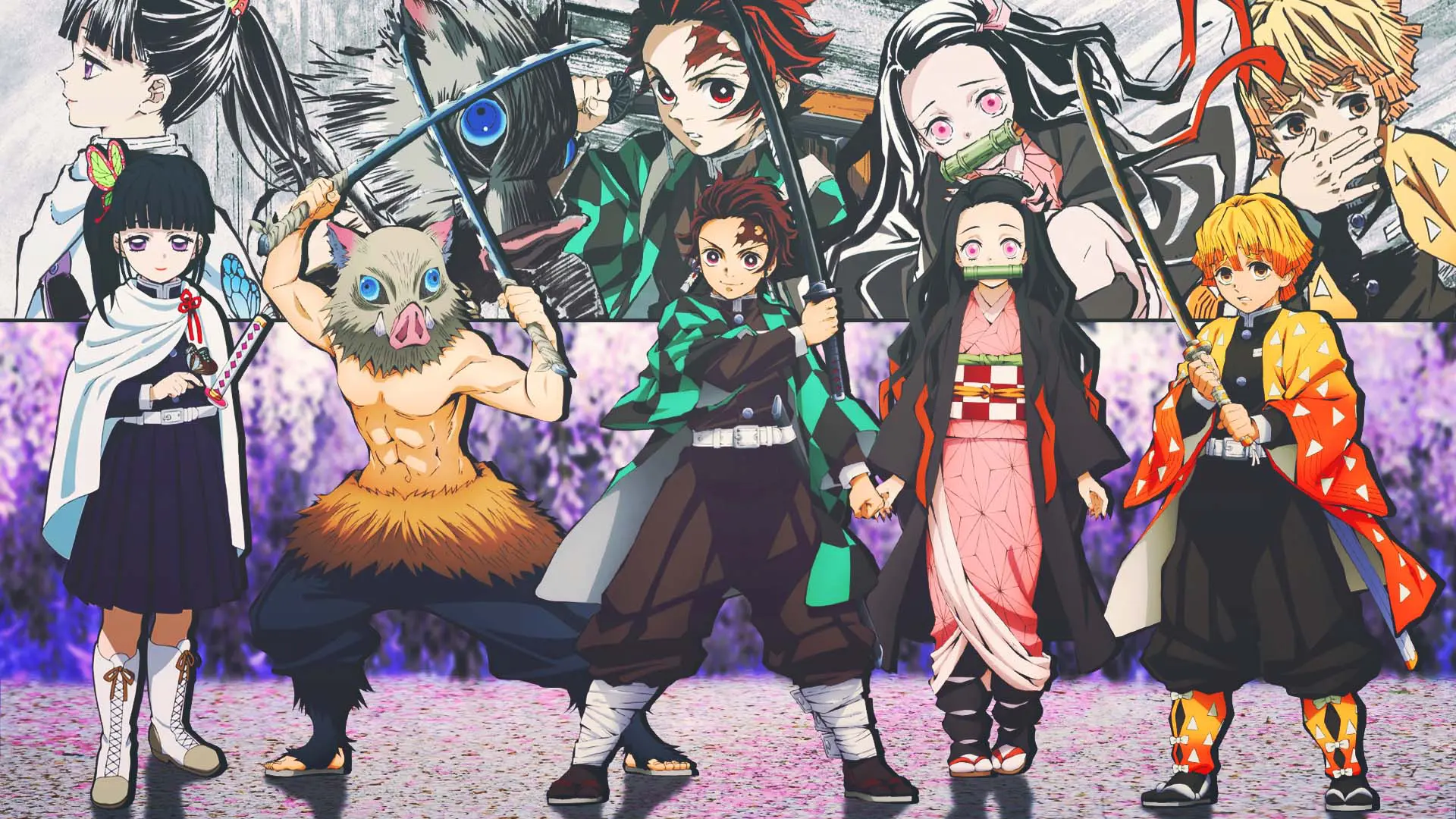 Hình nền thanh gươm diệt quỷ các tân binh của đoàn diệt quỷ Kanao, Inosuke, Tanjiro, Nezuko và Zenitsu